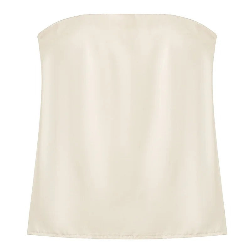 Il top a fascia scivola dolcemente sul corpo, valorizzando le spalle e il décolleté con una linea pulita e raffinata.